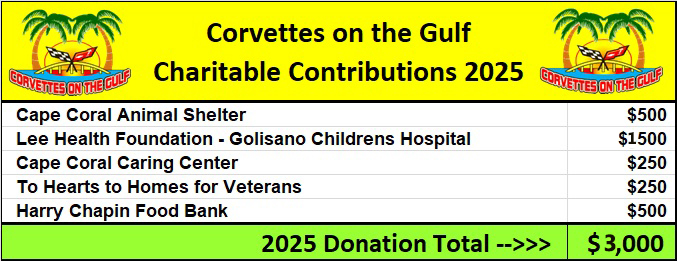 Corvettes on the Gulf members enjoy the opportunity to annually help support many area charities with club donations as well as showing support and active participation in area community events. Our "helping others" philosophy is a cherished and major part of what we do as a social organization. A sampling of some of the past and current charity donation presentations and community events are highlighted on this page along with an accounting of COTG's annual charitable donations.